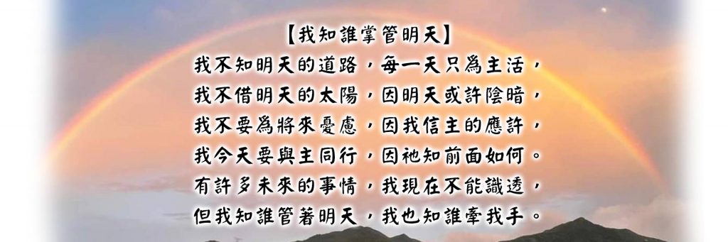 你知道誰掌管明天嗎?你的「明天」如何,是「今天」快樂生活的秘訣,我們的主掌管明天,所以不為明天憂慮。主掌管明天,所以不為明天誇口。主掌管明天,所以忠於今天。順服主的旨意,任何臨到的一切,都是祂最美的安排。